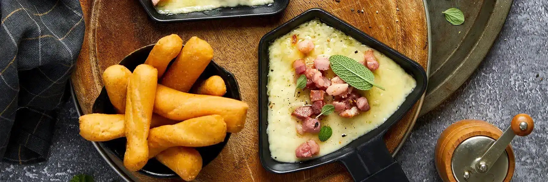 In una padella antiaderente scaldate l’olio. Rosolate la pancetta per ca. 5 min. Trasferite le fette di formaggio nei pentolini da raclette. Distribuite sopra la pancetta, le foglioline aromatiche e un pizzico di pepe. Fate sciogliere il formaggio nel fornello da raclette per ca. 8 min.